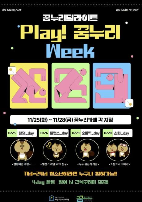 한방통신사 신유철기자 기자 | 의왕시청소년재단 산하 의왕시청소년수련관 꿈누리카페(▲고천점( 문화공원로 33), ▲내손점(복지로 109), ▲오전점(찬우물길 11), ▲백운밸리점(백운중앙로 74, 총 4개 지점))는 오는 11월 25일부터 28일까지 4일간 꿈누리딜라이트 『Play! 꿈누리 Week』를 진행한다고 밝혔다.