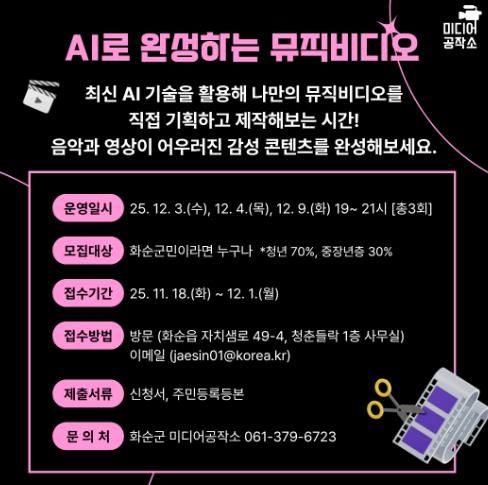 한방통신사 신다은기자 기자 | 화순군은 오는 12월 3일부터 화순군민을 대상으로 화순군 청년센터(청춘들락) 미디어공작소에서 ‘AI로 완성하는 뮤직비디오 영상 제작하기’ 교육을 진행한다고 밝혔다.