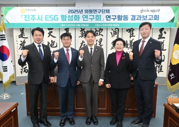 이날 시의회 2층 회의실에서 열린 보고회에는 최지원 대표의원을 비롯해 윤성관·임기향·김형석·최호연 의원 등 연구단체 소속 의원들이 참석했다. 이들은 세계적인 추세인 ESG(환경·사회·지배구조) 경영 요구 확산에 대응해 진주시 행정 전반에서의 ESG 관점 도입, 중소기업 지원 정책 플랫폼 구축 등의 필요성에 뜻을 모았다.