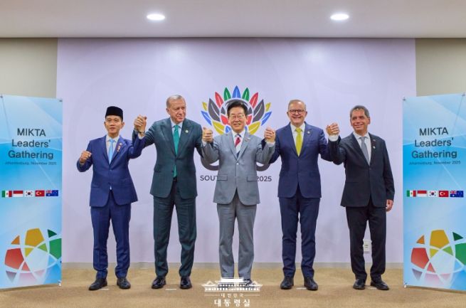 한방통신사 신유철기자 기자 | 주요 20개국(G20) 정상회의 참석을 위해 남아프리카공화국을 방문한 이재명 대통령은22일(현지시간) 오후 우리나라, 멕시코, 인도네시아, 튀르키예, 호주 5개국으로 구성된 믹타(MIKTA) 회원국 정상들과 회동했다.