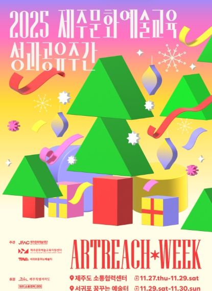 한방통신사 신유철기자 기자 | 제주문화예술재단은 오는 27일부터 30일까지 4일간 제주도 소통협력센터(제주시 관덕로 44)와 서귀포 꿈꾸는 예술터(서귀포시 천제연로 164)에서 2025년 제주문화예술교육 성과를 도민에게 공유하는 문화예술교육 축제인 '아트리치위크'를 운영한다.