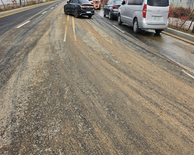 당수지구 내 포장도로는 곳곳이 진흙으로 뒤덮였고, 차량이 지날 때마다 흙먼지가 공중으로 퍼져 나갔다. 이는 대형 트럭들이 세륜기 없이 현장을 출입한 결과다.
