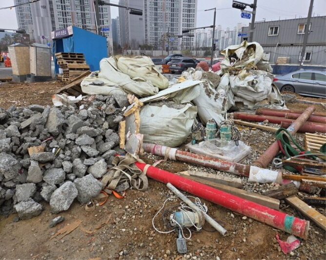 LH가 짖는 행복주택 신축현장인 A-5BL의 시공사 현장사무실과 수원 당수 1지구 C3 블록 공동주택 신축공사장 인근에는 폐콘크리트·잡석·생활쓰레기 등이 뒤엉켜 방치된 야적 더미가 다수 발견됐다. 슬러지 보관함에는 슬러지는 없고 정체불명의 기름통 두 개가 그대로 놓여 있었다.