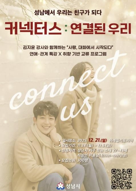 한방통신사 신유철기자 기자 | 성남시는 새로운 친구를 만들 수 있는 청년 교류 행사 ‘커넥터스(Connect-us) 연결된 우리’ 참가 희망자 300명을 오는 12월 5일까지 모집한다.