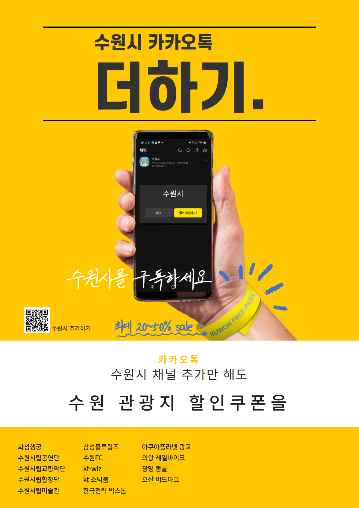모바일 메신저 카카오톡에서 ‘수원시’와 친구를 맺으면 수원시 주요 관광시설, 문화공연, 스포츠 경기, 인근 도시 관광시설 등을 무료·할인 가격으로 이용할 수 있는 ‘카카오톡 쿠폰’을 지급한다.