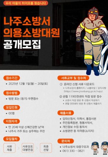 한방통신사 신다은기자 기자 | 나주소방서는 지역사회의 안전을 책임질 “2025년 하반기 의용소방대 신규대원 모집”에 나선다. 모집 기간은 오는 12월 1일부터 20일까지이며, 신천서류는 나주소방서 홈페이지 또는 나주소방서를 비롯한 119안전센터에서 지원 서류를 배부하고 접수를 진행한다.