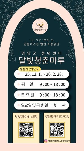 김선미 영암군 인구청년과장은 “청년들이 안전하게 달빛청춘마루를 이용할 수 있도록 부득이하게 겨울철 운영 시간을 줄이게 됐다. 내년 3월부터는 다시 야간 운영을 재개해 청년 활동을 지원하겠다”고 밝혔다.