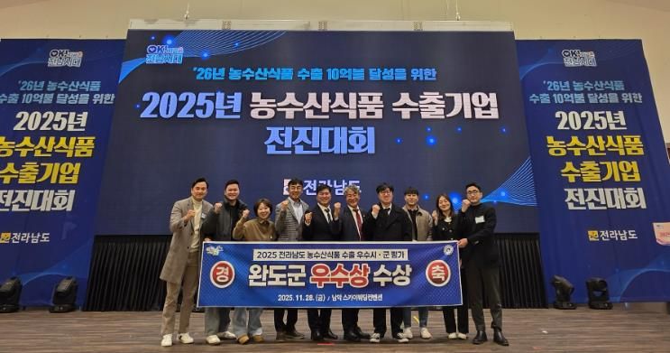 한방통신사 신다은기자 기자 | 완도군은 지난 11월 28일 전남 무안군에서 열린 '2025년 전남 농수산식품 수출 우수 시군 평가'에서 22개 시군 중 우수상을 수상했다.