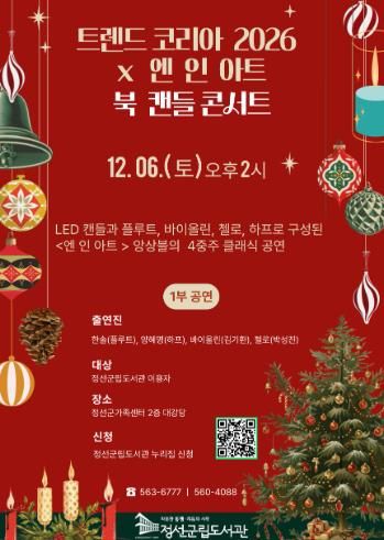 한방통신사 양호선기자 기자 | 정선군립도서관은 오는 12월 6일 오후 2시, 정선군 가족센터 2층 대강당에서 ‘트렌드 코리아 2026 × 엔 인 아트 북 캔들 콘서트’를 개최한다고 2일 밝혔다.