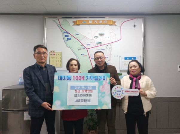 한방통신사 신유철기자 기자 | 밀양시 내이동 세종종합PVC(대표 정병욱)은 지난 7월 ‘100+4 기부릴레이 시즌2’의 첫 주자로 참여한 데 이어 2일 내이동 자원봉사회(회장 서정구)에 200만 원을 추가로 기탁했다.