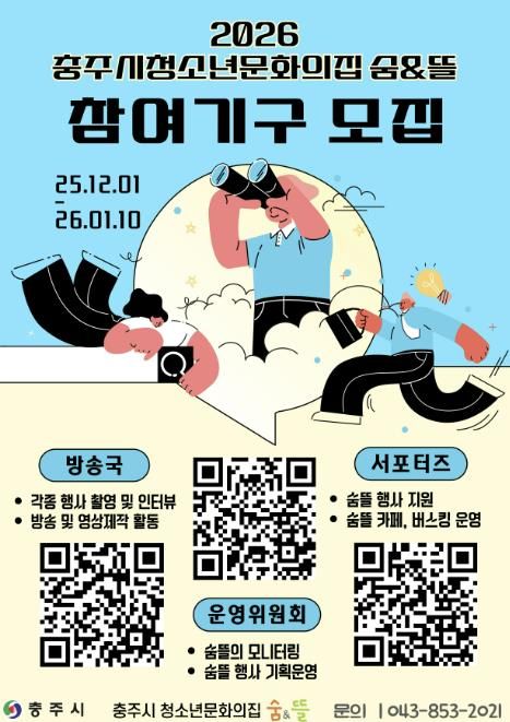 한방통신사 권영분기자 기자 | 충주시청소년문화의집 숨&뜰은 2026년을 함께할 청소년 참여기구 신규부원을 모집한다고 4일 밝혔다.