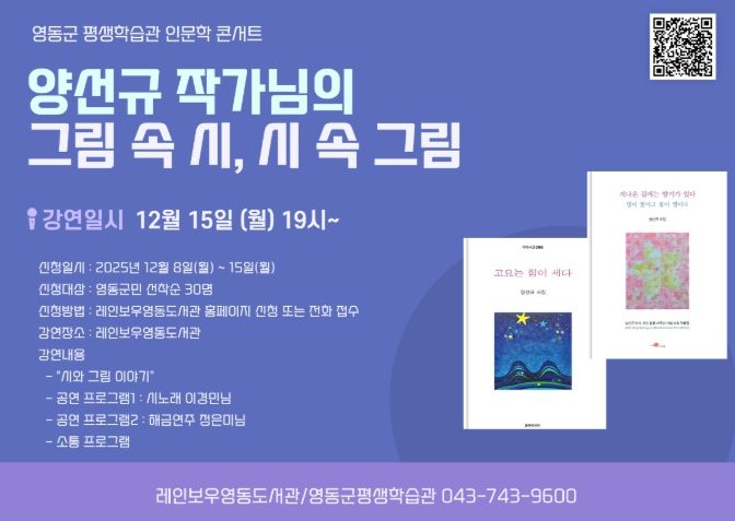 이번 북콘서트는 작가 특강, 국악 공연, 시노래 무대, 관객 참여 대화, 질의응답 등 다양한 프로그램으로 구성되며, 15일 오후 7시 평생학습관(레인보우영동도서관)에서 진행된다.
