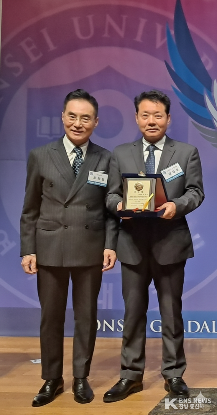 - 조태형 동창회장(좌) '연세를 빛낸 경제인 상' 수상자 정정길(우) 세영종합무역상사 대표