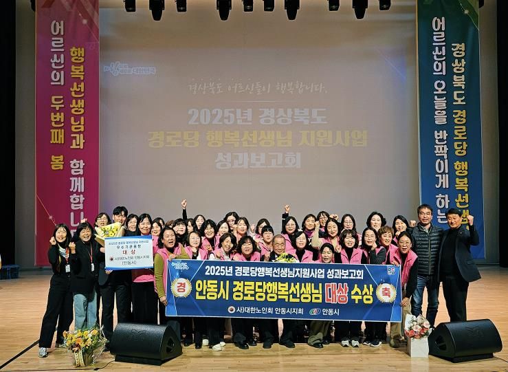 한방통신사 신유철기자 기자 | 안동시와 (사)대한노인회 안동시지회는 12월 18일, 경상북도가 경북도청 동락관에서 개최한 ‘경로당 행복선생님 지원사업 2025년도 성과보고회’에서, 도내 22개 수행기관을 대상으로 한 사업평가 결과 ‘대상’을 수상하는 영예를 안았다.