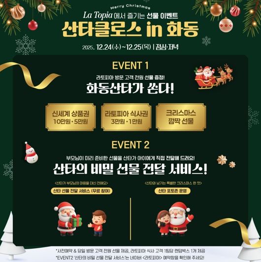 ‘화동 산타가 쏜다’는 라토피아 식사 고객 전원에게 랜덤 박스를 증정하는 깜짝 이벤트다. 무엇이 나올지 모르는 설렘이 크리스마스의 재미를 더한다. 아이들을 위한 특별한 순간도 마련됐다. 부모가 미리 준비한 선물을 산타가 직접 전달하는 산타의 비밀 선물 전달 이벤트다. 산타를 만난 아이들의 웃음이 공간을 가득 채울 예정이다.