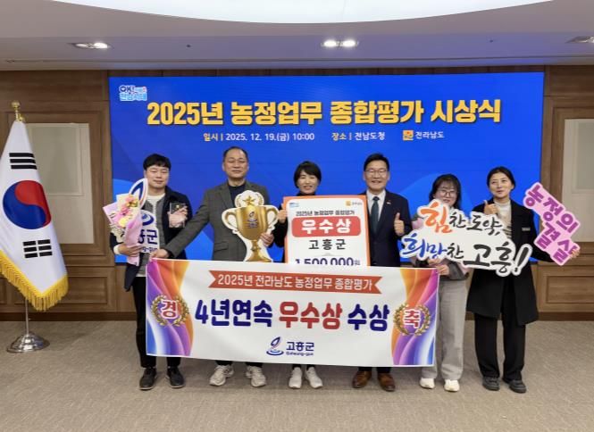 한방통신사 신다은기자 기자 | 고흥군이 전라남도가 주관한 ‘2025년 농정업무 종합평가’에서 4년 연속 ‘우수상’을 수상하며, 농업 강군(强郡)으로서의 위상을 다시 한번 입증했다.