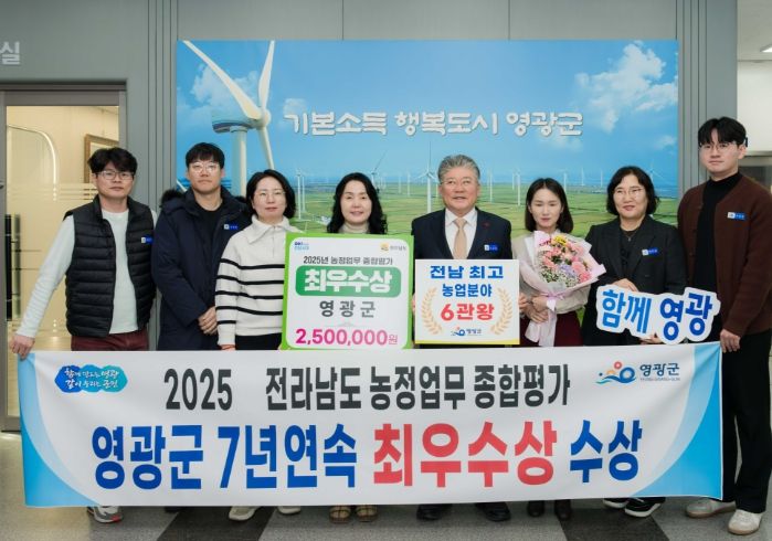 한방통신사 신다은기자 기자 | 영광군은 전라남도 2025년 농정업무 종합평가에서 7년 연속 최우수상을 수상하며, 농정 전반에서의 균형 있는 성과로 도내 최고 수준의 농정 역량을 다시 한번 입증했다.