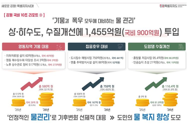 김진태 지사는 “국비 10조 시대를 맞아, 가뭄과 폭우 등 물관리 사업에 국비 900억 원을 포함해 총 1,455억 원이 강원도에 투자될 계획”이라며, “또한, 전국 최초로 가뭄백서를 제작해 향후 유사 재난 발생 시 더 효과적으로 대비할 수 있는 기초 자료로 활용할 것”이라고 말했다.