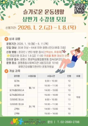 한방통신사 신유철기자 기자 | 광명시 광명건강생활지원센터는 새해를 맞아 시민들의 건강한 생활습관 형성과 만성질환 예방을 위해 2026년 상반기 ‘슬기로운 운동생활’ 운동 프로그램 참여자를 모집한다.