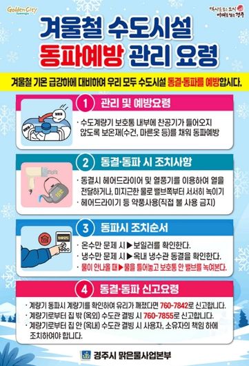 주낙영 경주시장은 “수도시설 동파는 사전 보온 조치만으로도 충분히 예방할 수 있는 만큼, 시민 한 분 한 분의 관심과 실천이 무엇보다 중요하다”며 “시는 현장 대응과 예방 홍보를 강화해 겨울철 수도 이용에 불편이 없도록 최선을 다하겠다”고 말했다.