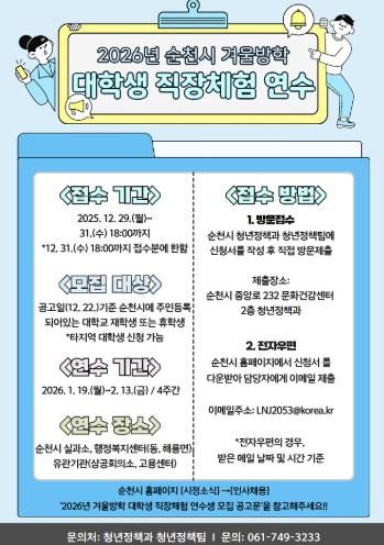한방통신사 신다은기자 기자 | 순천시는 겨울방학을 맞아 대학생들에게 행정 현장 경험의 기회를 제공하기 위해 ‘2026년 겨울방학 대학생 직장체험 연수생’을 모집한다고 밝혔다.