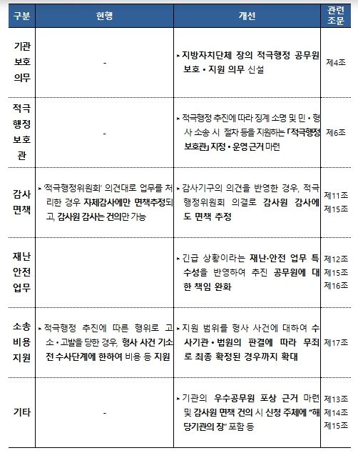 적극행정 추진으로 징계 소명 및 민·형사상 소송이 진행되는 경우 소속기관 차원의 보호·지원이 의무화되고, 적극행정 보호관을 지정해 공무원을 보호해야 한다.