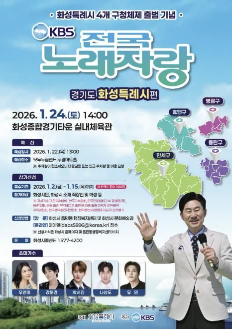 한방통신사 신유철기자 기자 | 화성특례시는 다음 달 2일부터 15일까지 ‘KBS 전국노래자랑’ 화성특례시편 참가자를 모집한다고 24일 밝혔다.