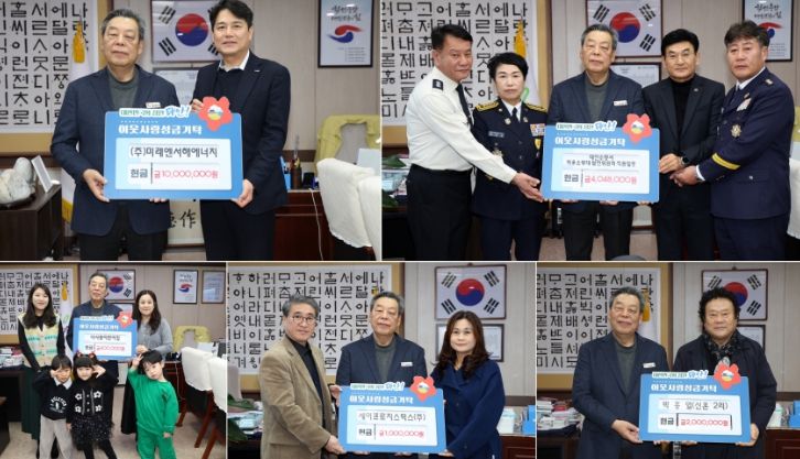 군은 지난 24일 △㈜미래엔서해에너지 △태안소방서(의용소방대·발전위원회·직원) △주민 박흥열 씨 △세이프로지스틱스(주) △다사랑어린이집이 태안군에 성금을 기탁했다고 밝혔다.