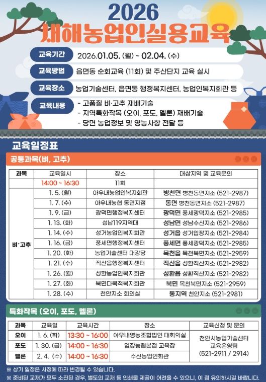 한방통신사 신태공 기자 | 천안시농업기술센터는 내년 1월 5일부터 2월 4일까지 ‘새해농업인실용교육’을 추진한다고 26일 밝혔다.