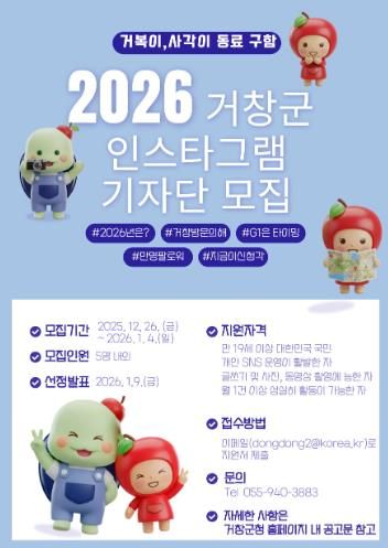 한방통신사 신유철기자 기자 | 거창군은 지역 관광자원의 매력을 생생하게 전달하고 온라인 홍보를 강화하기 위해 ‘2026년 거창군 인스타그램 기자단’을 모집한다고 26일 밝혔다.