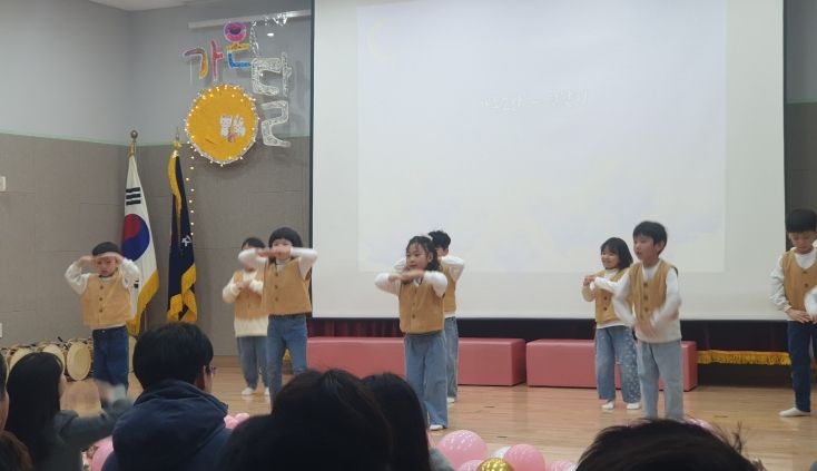 1부에서는 가온1·2반 유아들이 준비한 오카리나 연주와 우리나라 놀이를 주제로 한 놀이 뮤지컬 공연이 펼쳐졌다. 사물놀이 ‘농악’, 소고춤 ‘청개구리 타령’, 전래놀이를 접목한 무대를 통해 유아들은 놀이 속에서 배우고 성장한 경험을 자신감 있게 표현했다.