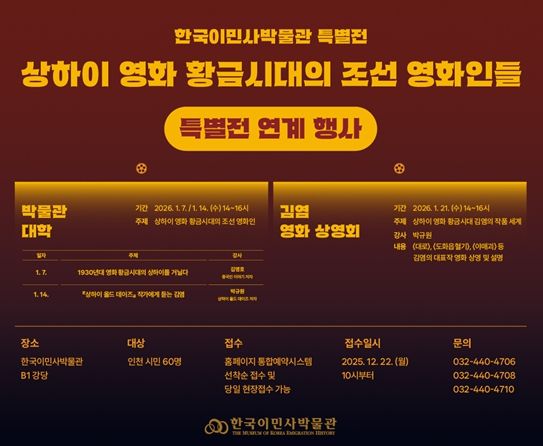한방통신사 신유철기자 기자 | 인천광역시 시립박물관 분관 한국이민사박물관은 특별전 〈상하이 영화 황금시대의 조선 영화인들〉과 연계해 유명 작가 초청 특강을 개최한다고 밝혔다.