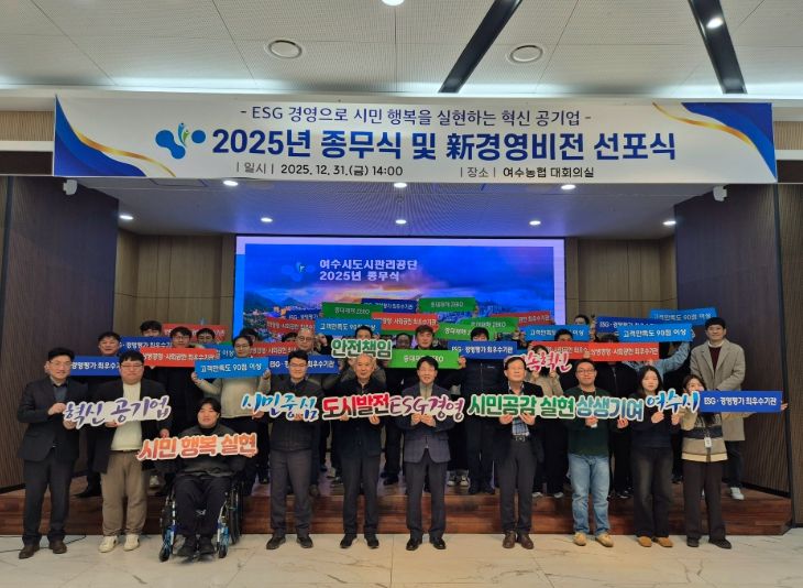 한방통신사 신다은기자 기자 | 여수시도시관리공단은 31일 공단 대회의실에서 ‘新 경영비전 선포식’을 개최하고, 향후 5년간 공단이 나아갈 새로운 경영 철학과 조직 혁신 의지를 대내외에 공식적으로 밝혔다.