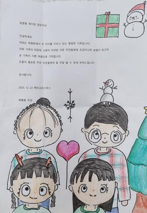 편지는 두 아이를 키우는 가정이라는 소개와 함께 도움이 필요한 이웃을 위하는 따뜻한 마음과 아이들이 직접 그린 눈사람, 선물 상자 등으로 꾸며져 따스함을 더했다.