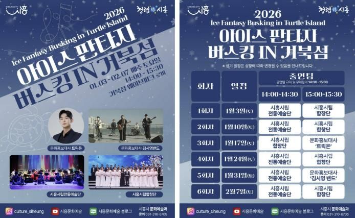 한방통신사 신유철기자 기자 | 시흥시는 지난 연말에 진행된 ‘2025 시흥 사운드 오브 윈터’의 열기를 잇는 후속 문화예술 프로그램으로, 겨울철 거북섬을 찾는 시민과 관광객에게 풍성한 즐길 거리를 제공하고자 ‘2026 아이스 판타지 버스킹 인 거북섬’을 운영한다.
