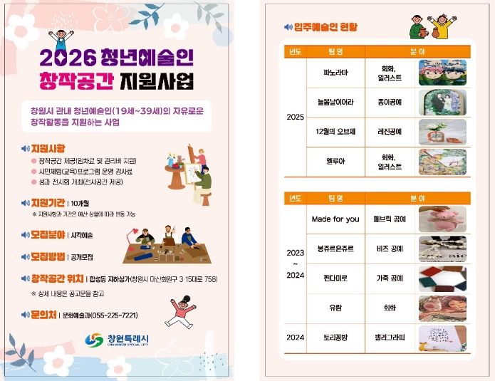 ▲접수 기간은 1월 14일부터 1월 28일 18시까지이며, 자세한 내용은 창원시 홈페이지 고시공고 '2026년 청년예술인 창작공간 지원사업』 입주예술인 공모에서 확인할 수 있다.