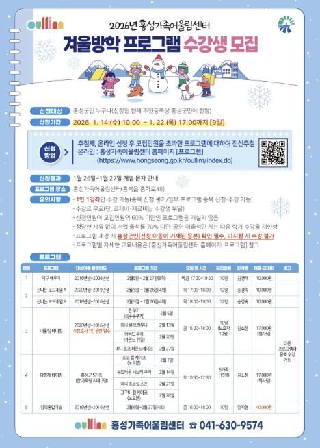 한방통신사 신태공 기자 | 홍성가족어울림센터는 관내 유아 및 초·중·고등학생을 대상으로 2026년 겨울방학 프로그램 수강생을 모집한다. 이번 프로그램은 놀이 중심의 체험형 교육을 강화하고, 보호자와 함께 참여할 수 있는 수업을 포함해 가족이 함께 즐길 수 있는 문화 활동으로 구성됐다.