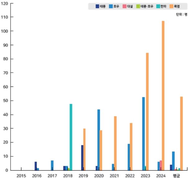 자연재난으로 인한 사망·실종자는 총 121명으로, 최근 10년 평균(56명) 대비 65명 증가했다. 원인별로는 폭염으로 인한 사망(108명)이 가장 많았고, 이 외 대설(7명), 호우(6명) 순으로 많았다.