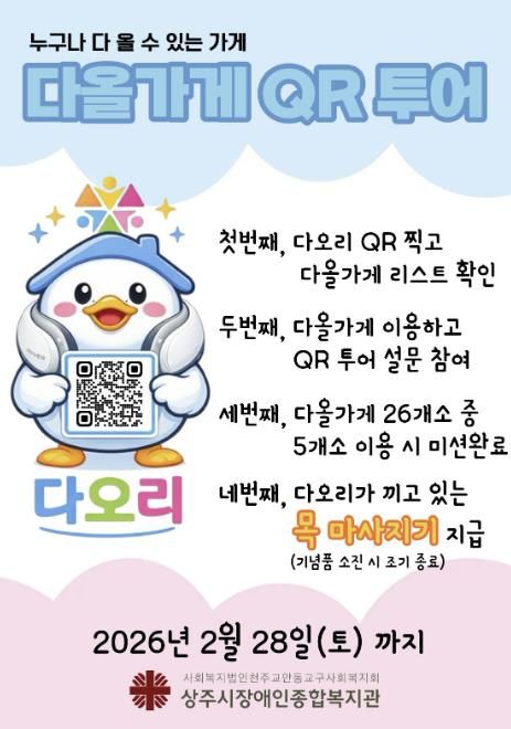 한방통신사 신유철기자 기자 | 상주시장애인종합복지관은 1월 2일부터 2월 28일까지 지역 내 무장애 상가 이용을 활성화하기 위한‘다올가게 QR 투어’ 캠페인을 진행한다.