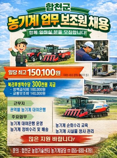 한방통신사 신유철기자 기자 | 합천군은 농기계대여은행 운영체계를 강화하고 농업인 영농 편의를 높이기 위해 2026년 농기계 업무보조원 기간제근로자 9명을 채용한다고 14일 밝혔다.