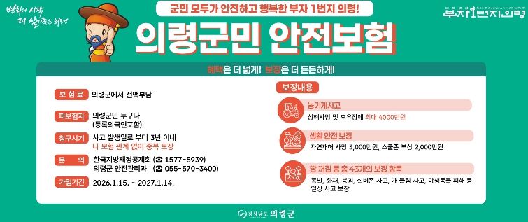 한방통신사 신유철기자 기자 | 의령군은 일상생활 중 예기치 못한 재난과 사고로부터 군민의 생활 안정을 지원하기 위해 ‘2026년 군민안전보험’에 갱신 가입하고, 1월 15일부터 본격 운영에 들어간다고 밝혔다.
