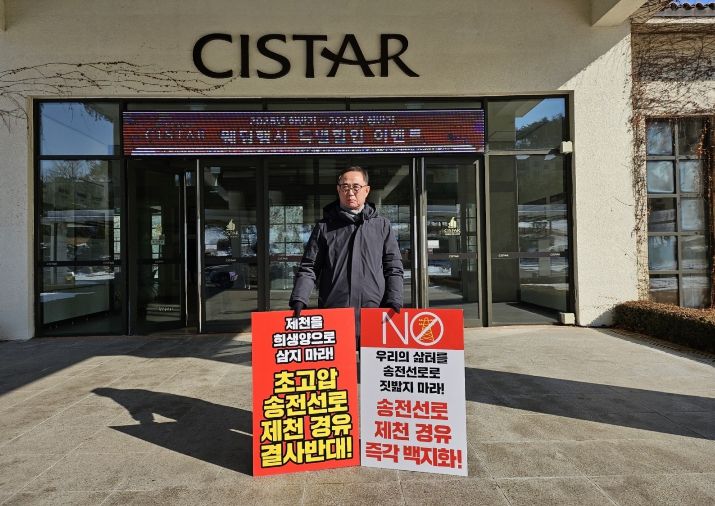 한방통신사 권영분기자 기자 | 제천 신평창-신원주 송전선로 건설사업 반대추진위원회 신창준 위원장은 지난 14일 영월 동강시스타에서 열린 제5차 입지선정위원회 회의장 앞에서 1인 시위를 벌이고, 송전선로 건설계획 중단과 입지 선정 절차의 전면 재검토를 강력히 촉구했다.