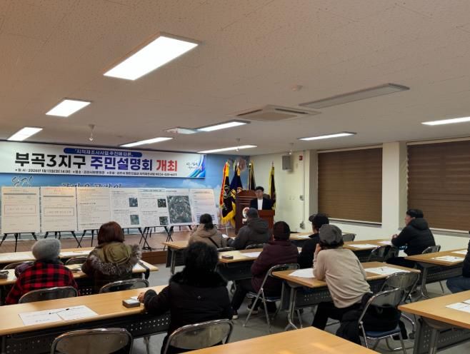 한방통신사 신유철기자 기자 | 김천시는 2026년 지적재조사사업 실시계획에 따른 사업지구 지정을 위하여 1월 13일 평화동 보훈회관에서 부곡3지구 토지소유자 및 이해관계인 등을 대상으로 주민설명회를 개최했다.