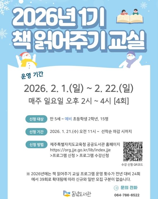 한방통신사 신유철기자 기자 | 제주도교육청 동녘도서관은 2월 1일부터 22일까지 평생교육실에서 유아 및 저학년 어린이의 독서 흥미와 창의력 향상을 위한 ‘2026년 1기 책 읽어주기 교실’을 운영한다.