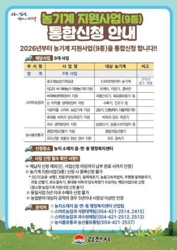 한방통신사 신유철기자 기자 | 김천시는 지역 농업인을 대상으로 ‘2026년 농기계 지원사업(9종)’ 신청을 오는 2026년 1월 30일(금)까지 농지소재지 읍면동 행정복지센터에서 접수한다고 밝혔다.