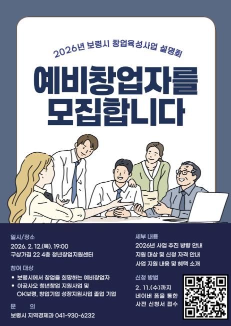 한방통신사 신태공 기자 | 보령시는 오는 2월 12일 오후 7시 청년창업지원센터에서 예비창업자 및 창업기업을 대상으로 ‘2026년 창업육성사업 설명회’를 개최한다.