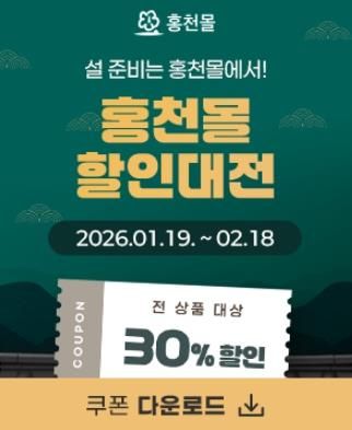 한방통신사 양호선기자 기자 | 홍천군 온라인 쇼핑몰 홍천몰은 설 명절을 맞아 고객 감사 행사로 전체 상품 30% 할인 쿠폰 기획전을 진행한다.