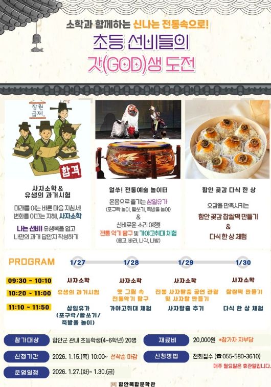 한방통신사 신유철기자 기자 | 함안군은 겨울방학을 맞아 오는 1월 27일부터 30일까지 함안복합문학관에서 관내 초등학생을 대상으로 ‘겨울방학 서당 프로그램-초등 선비들의 갓(GOD)생 도전’을 운영한다고 밝혔다.