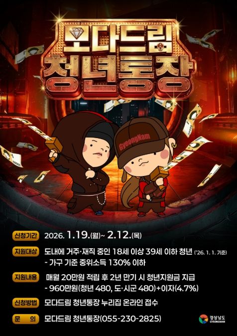 한방통신사 신유철기자 기자 | 경상남도와 경남투자경제진흥원은 청년의 자산 형성과 지역 정착을 돕는 ‘모다드림 청년통장’ 상반기 참여자를 1월 19일부터 2월 12일까지 모집한다고 밝혔다.