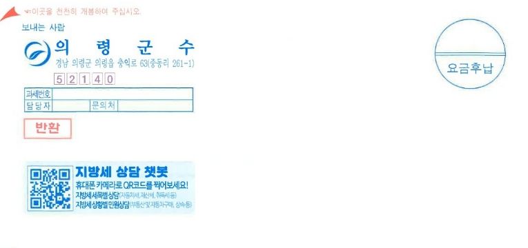 한방통신사 신유철기자 기자 | 의령군은 지방세 고지서 전면에 ‘지방세 챗봇 상담서비스’ QR코드를 삽입해 발송한다고 밝혔다.